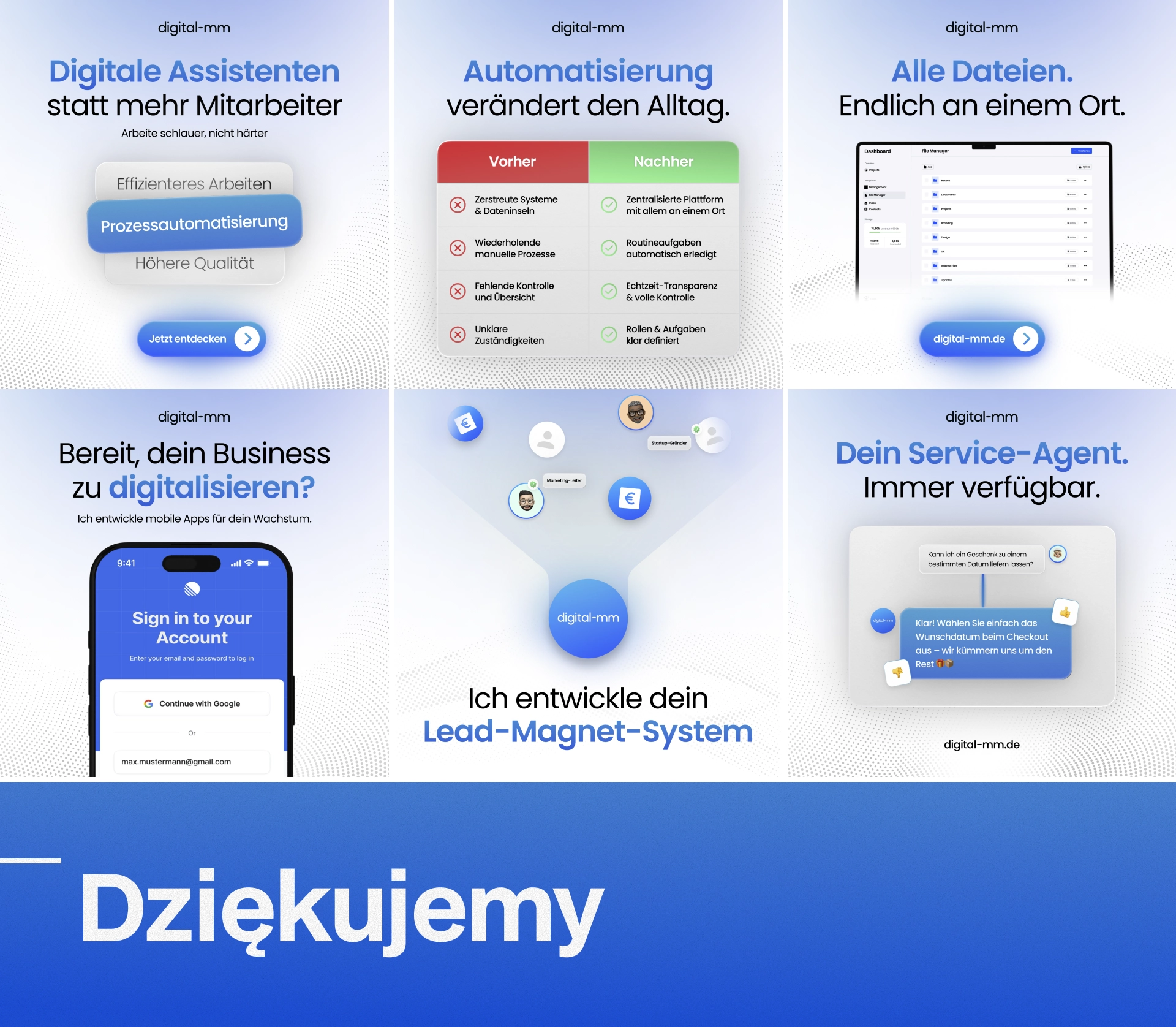 Dla firmy technologicznej Digital-mm, specjalizującej się w automatyzacji procesów i rozwiązaniach AI, stworzyliśmy nowy key visual dla kanałów social media. Celem projektu było opracowanie spójnej, nowoczesnej identyfikacji wizualnej, która w czytelny sposób oddaje innowacyjny charakter marki i wspiera jej komunikację online.