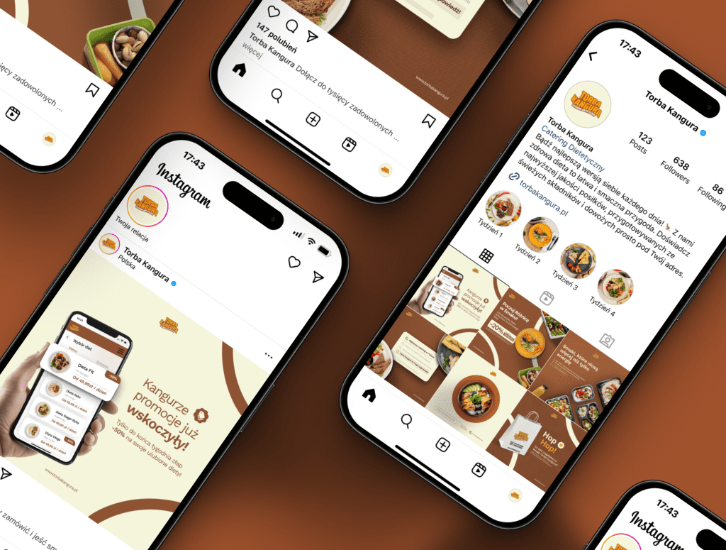 Torba Kangura to catering dietetyczny oferujący zdrowe posiłki dostarczane prosto do klienta. Naszym zadaniem było zaprojektowanie serii postów graficznych – edukacyjnych, angażujących i sprzedażowych – w pełni zgodnych z identyfikacją wizualną marki, które wspierają rozpoznawalność oraz budują zaufanie w social mediach.